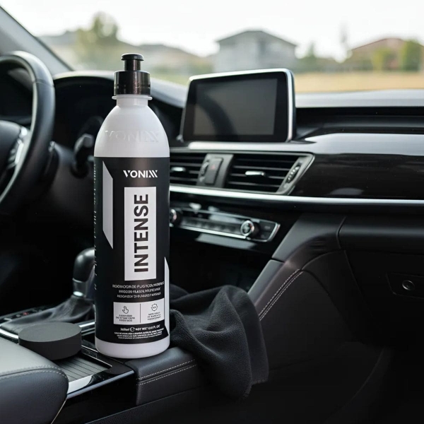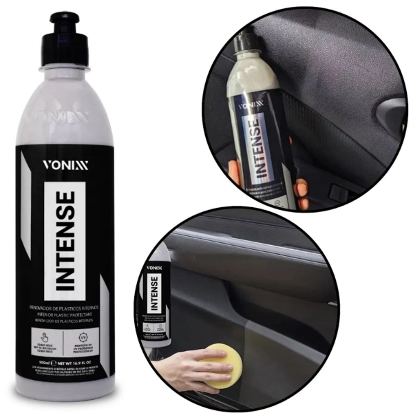 Intense é um renovador de plástico com proteção UV, cuja fórmula balanceada promove acabamento natural e toque seco, com durabilidade de 6 meses. O produto deve ser utilizado especificamente na parte interna do automóvel, em superfícies como vinil e plástico em geral.