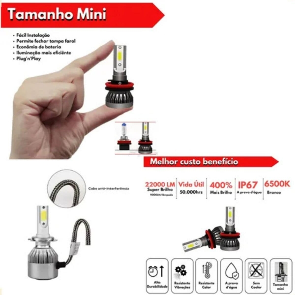 Tecnologia Super LED: Potência de 20.000 lúmens no par, com luz branca intensa de 6500K, que melhora a visibilidade e o design do seu carro, além de economizar energia da bateria.