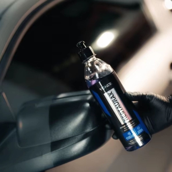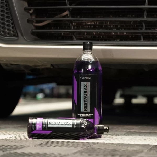 Restaurax renova e restaura superfícies plásticas, como para-choques, painéis e laterais de portas. Sua fórmula contém polímeros especiais que também protegem as peças contra as ações do tempo, evitando degradação precoce do material