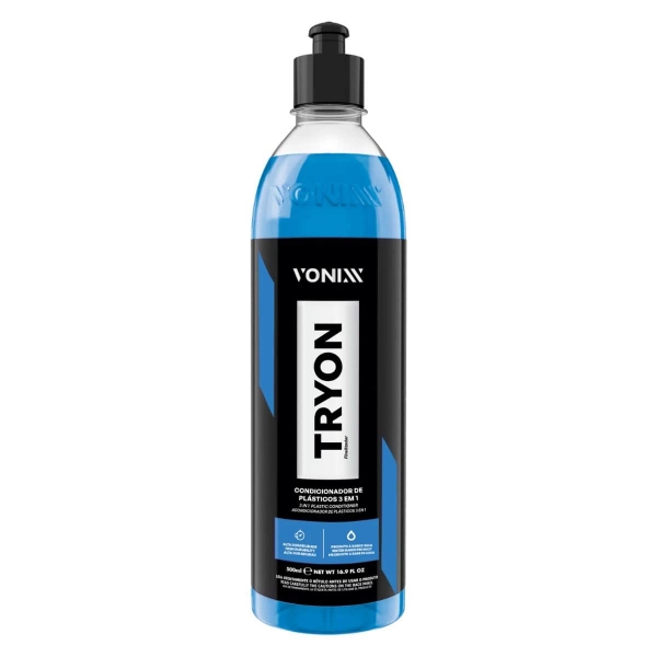 Tryon é um condicionador de plásticos 3 em 1, desenvolvido para restaurar plásticos internos, externos e borrachas. O produto é à base d’água e contém SiO2 em sua fórmula, o que proporciona alta durabilidade. Ele protege plásticos internos por até 12 meses, plásticos externos por até 3 meses e borrachas por até 6 meses. O produto oferece renovação e hidrorrepelencia, mantendo a superfície protegida.